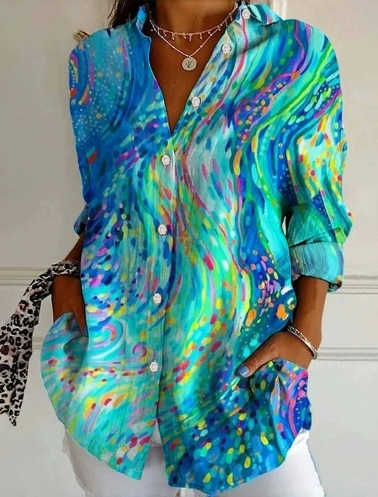 V-Ausschnitt Langarm Geometrisch Print Regelmäßig Mikroelastizität Weit Knopfhemd Bluse für Damen