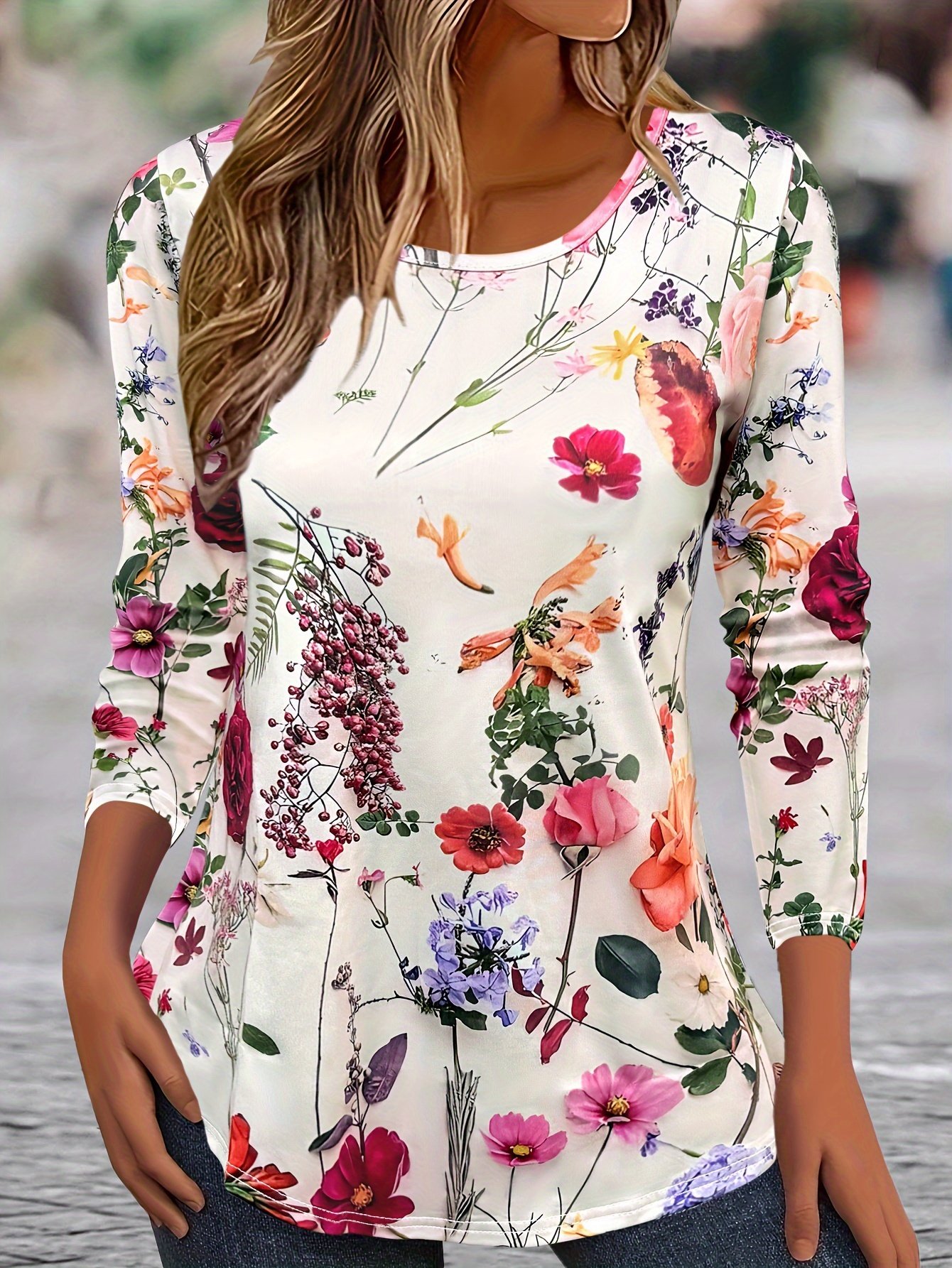 Lässig Geblümt Rundhals Langarm T-Shirt