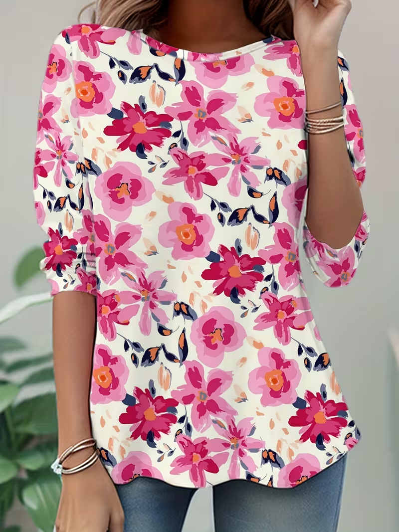 Lässig Geblümt Rundhals Langarm T-Shirt