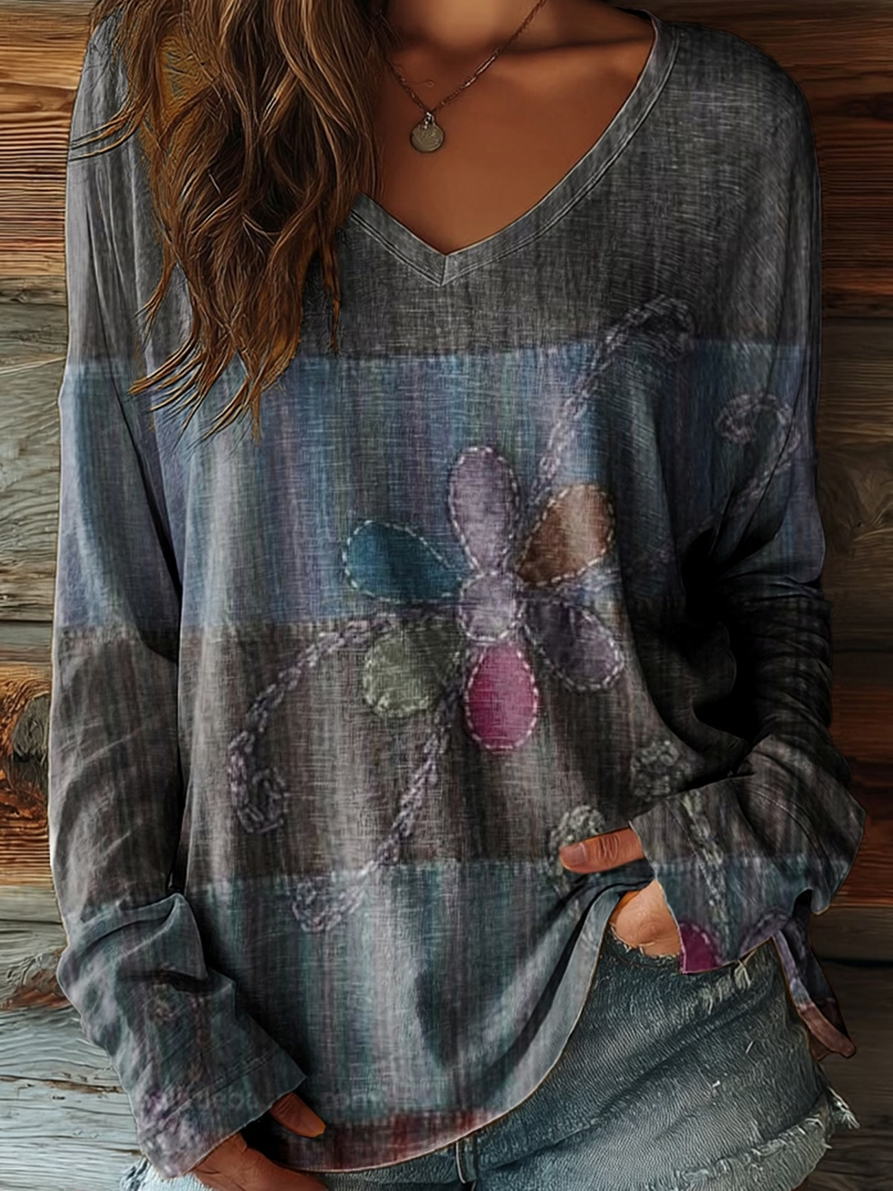 Lässig Geblümt V-Ausschnitt Langarm T-Shirt