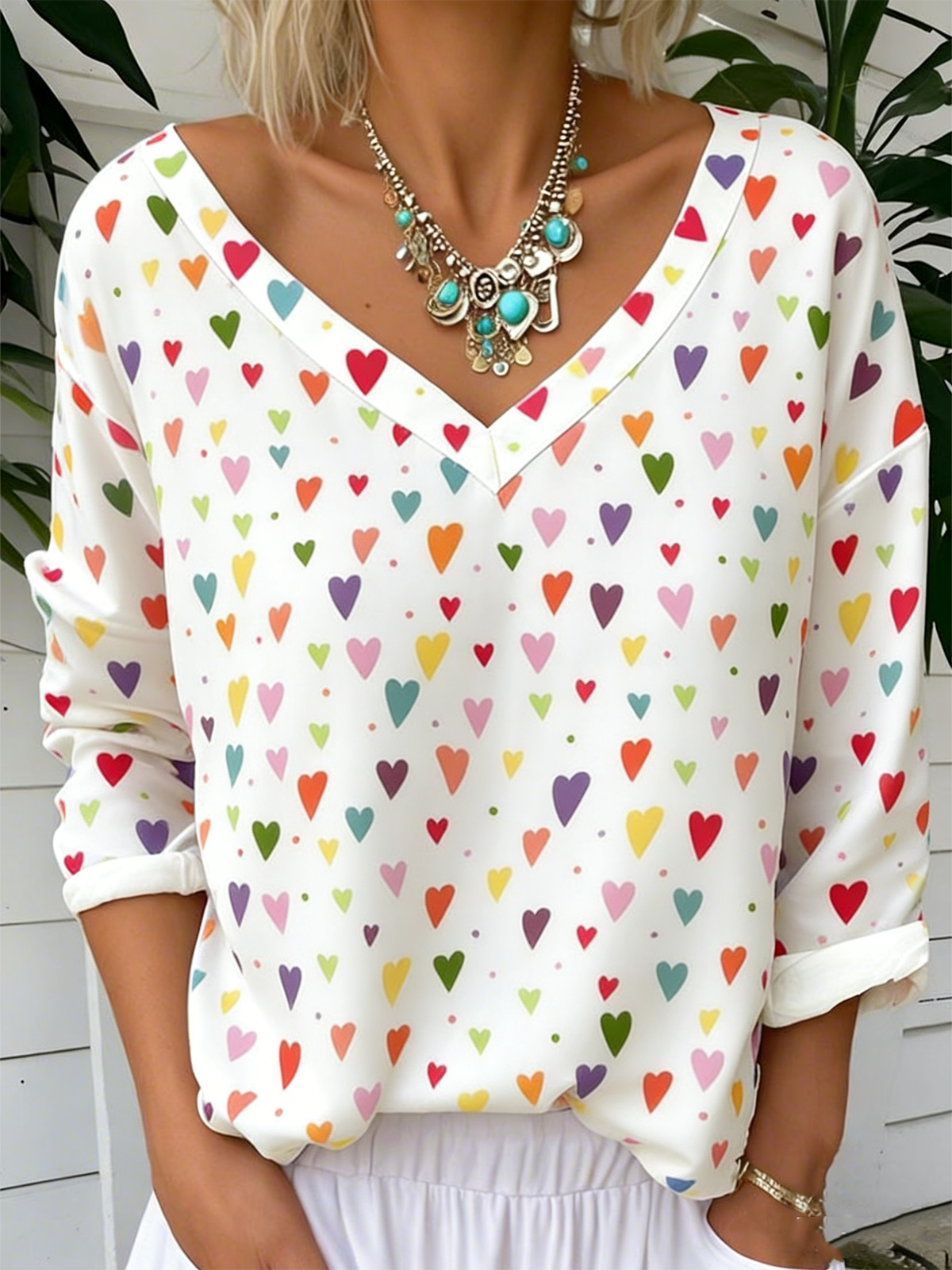 Lässig Blätter V-Ausschnitt Langarm T-Shirt