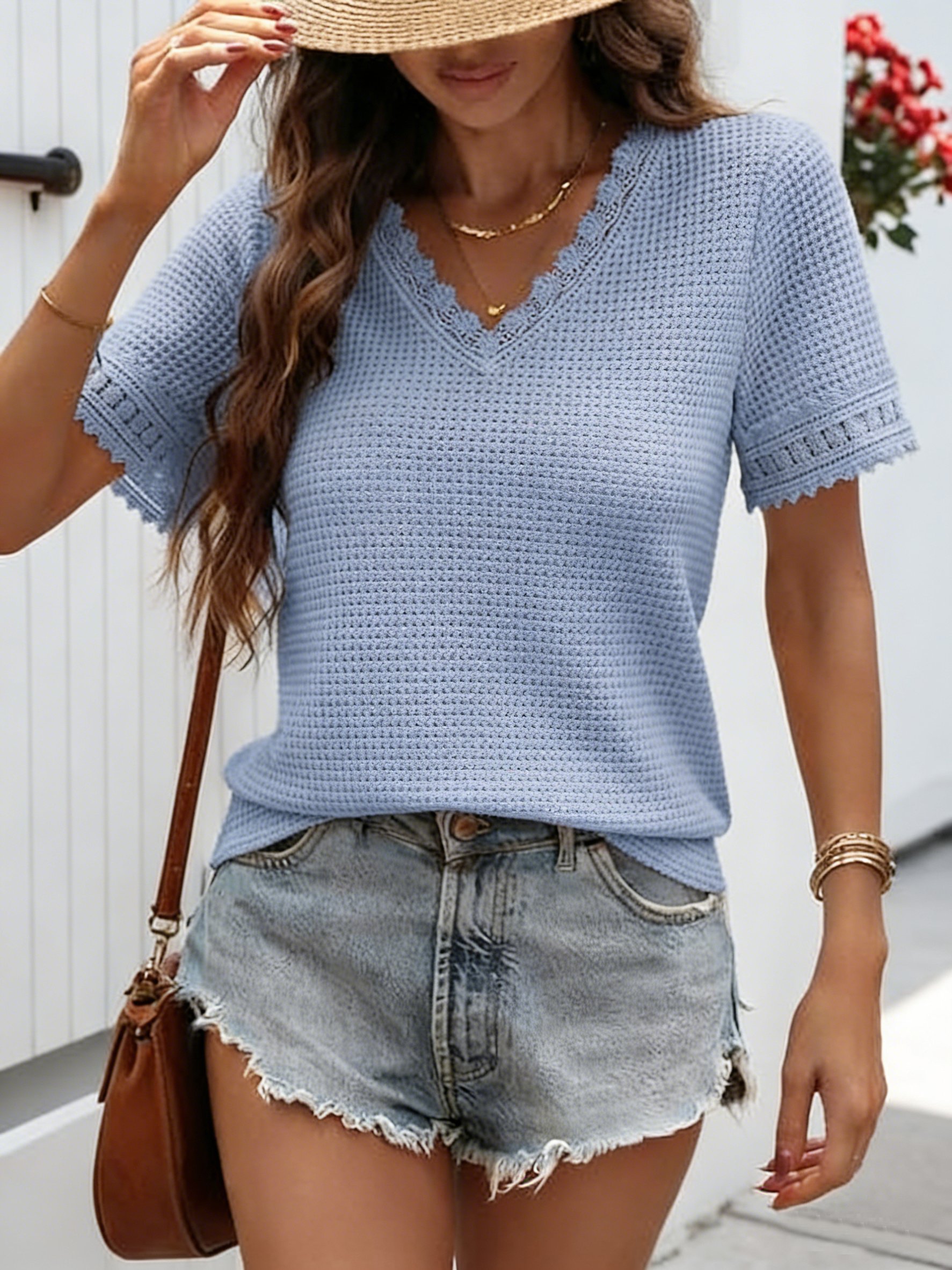 Lässig Unifarben V-Ausschnitt Kurzarm T-Shirt