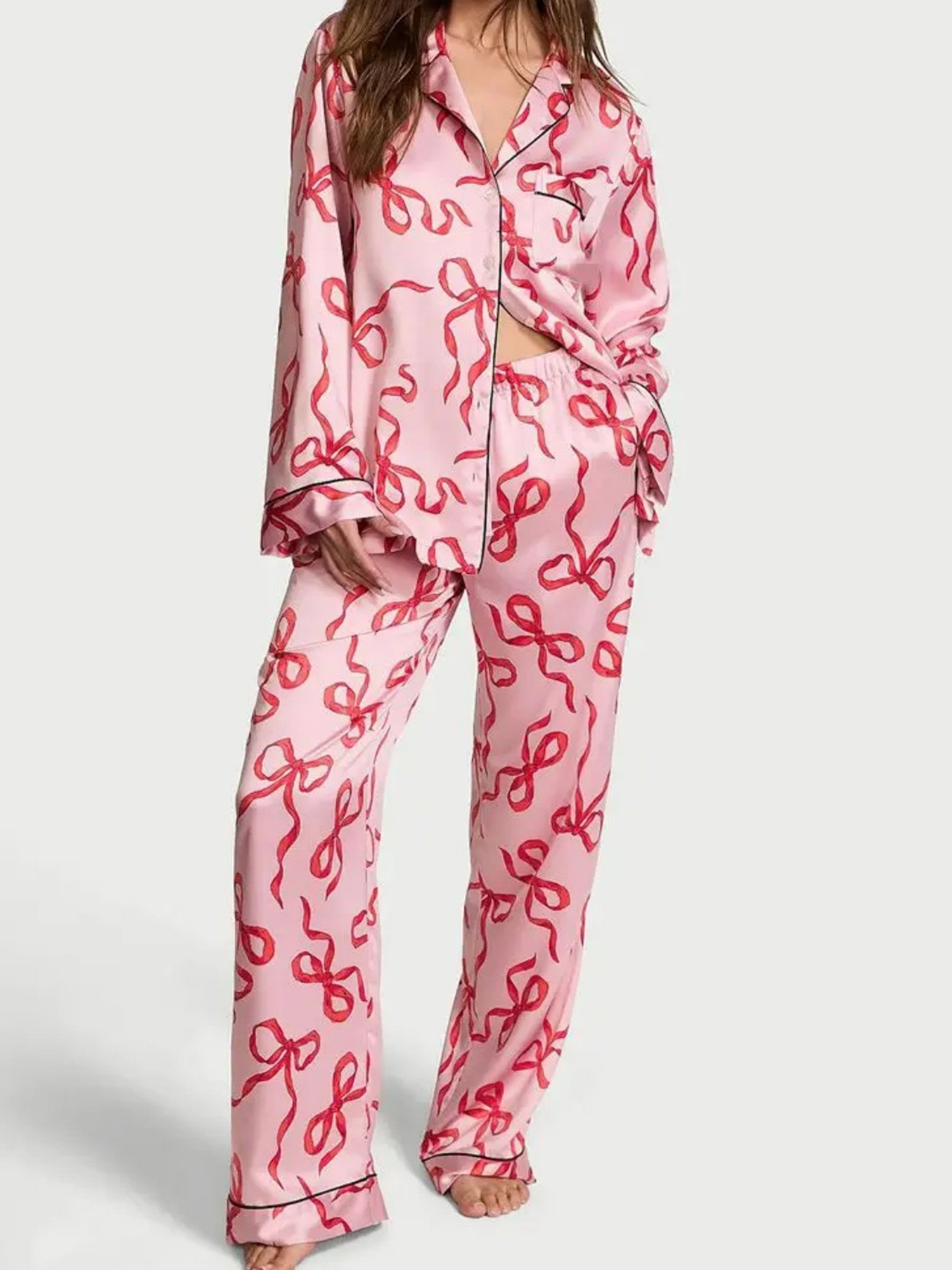 Lässig Schalkragen 3d Drucken Schleife Print Langarm Bluse Mit Hosen Pyjama Set