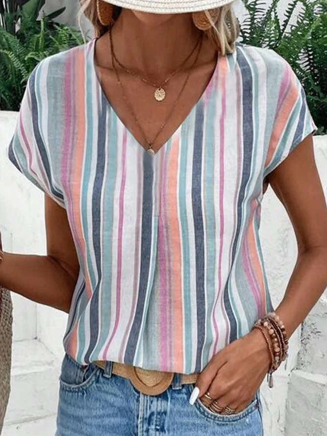 Lässig Gestreift V-Ausschnitt Kurzarm T-Shirt