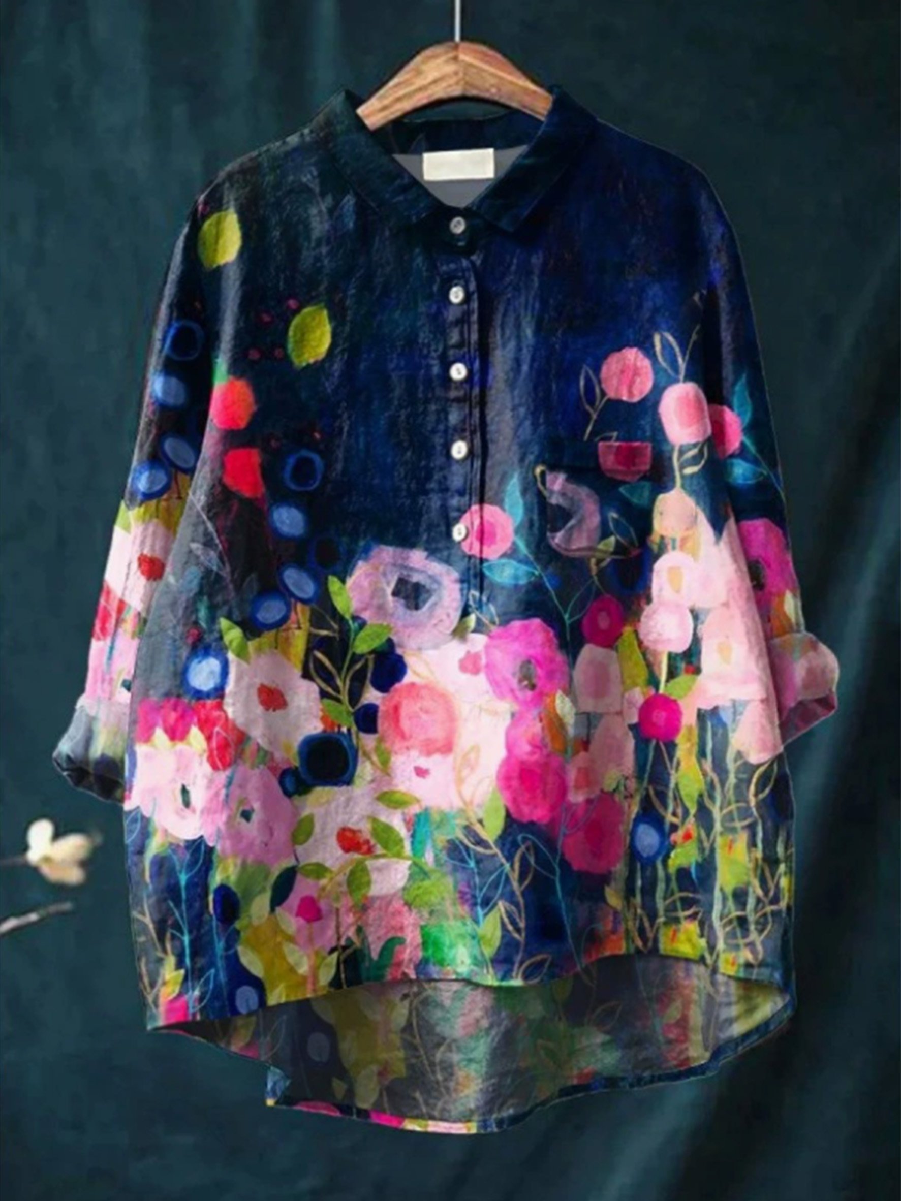 Schalkragen Langarm Geblümt Regelmäßig Weit Bluse für Damen