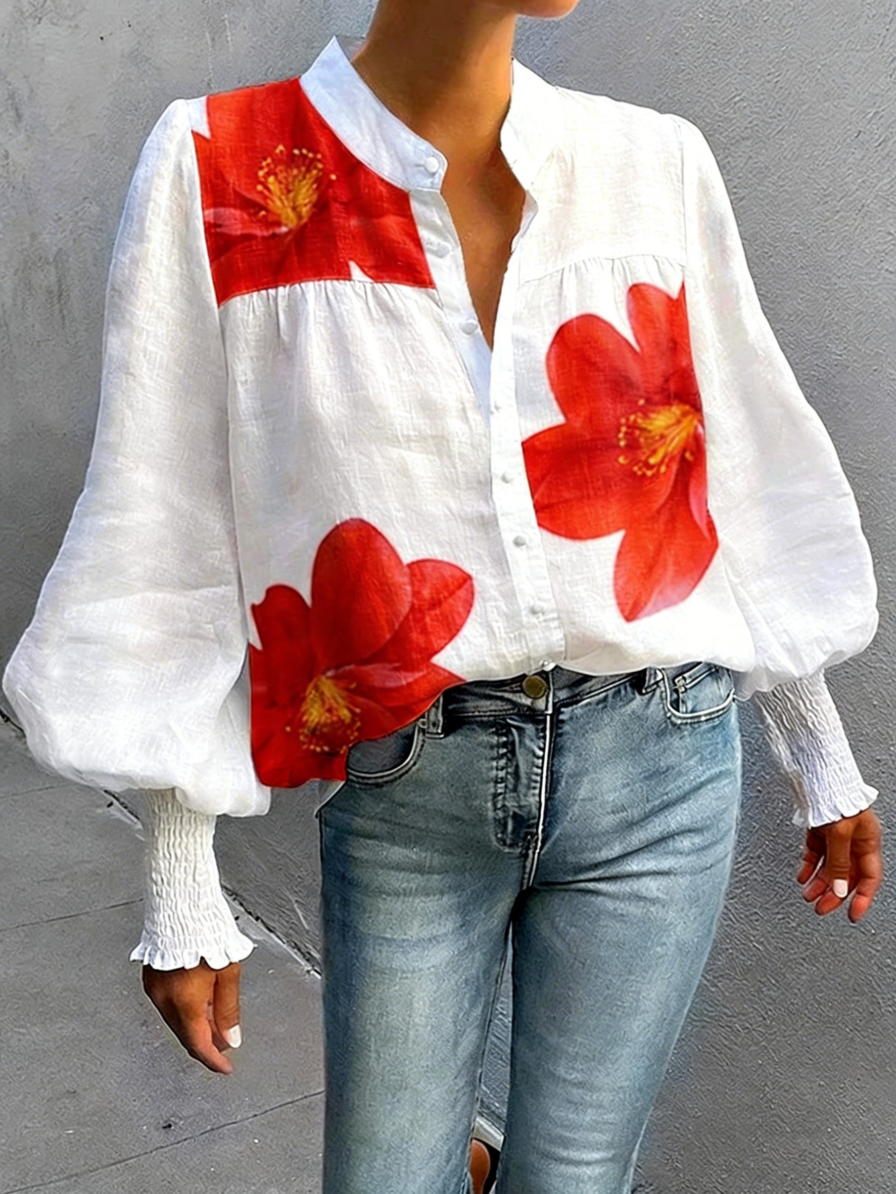 Stehkragen Langarm Geblümt Regelmäßig Weit Bluse für Damen