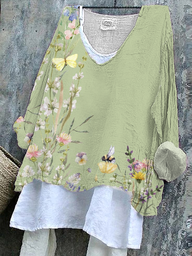 V-Ausschnitt Langarm Geblümt Print Regelmäßig Mikroelastizität Weit T-Shirt mit Grafik Bluse_ für Damen