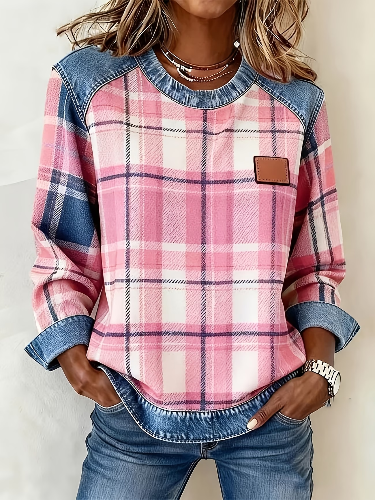 Retro Rundhals Kariert Sweatshirt Print