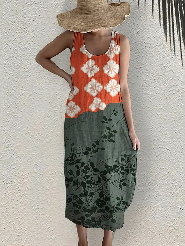 Damen Geblümt Sommer Kleid Rundhals Ärmellos Tanktop H-Linie Kleid