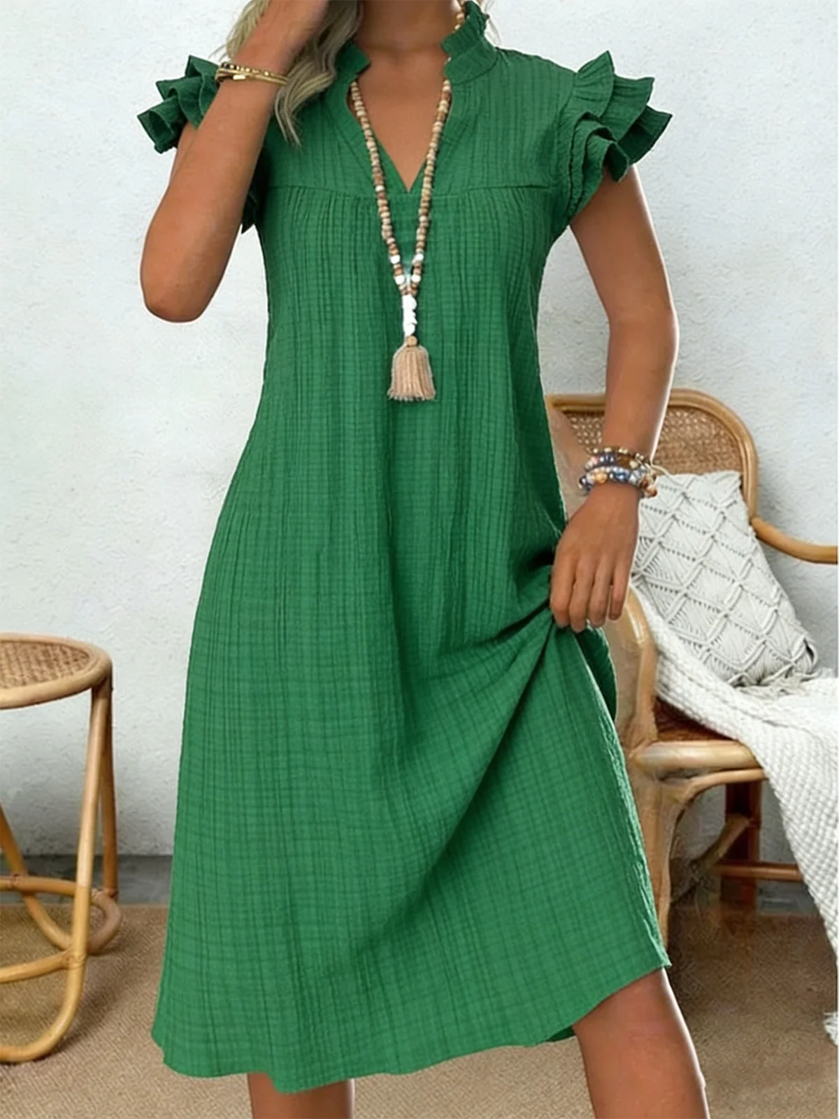 Damen Unifarben Rüschenärmel Sommer Kleid Ärmellos A-Linien-Kleid