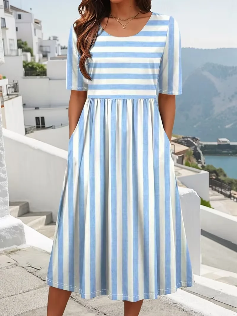 Damen Gestreift Sommer Print Kleid Rundhals Kurzarm Etuikleid H-Linie Kleid